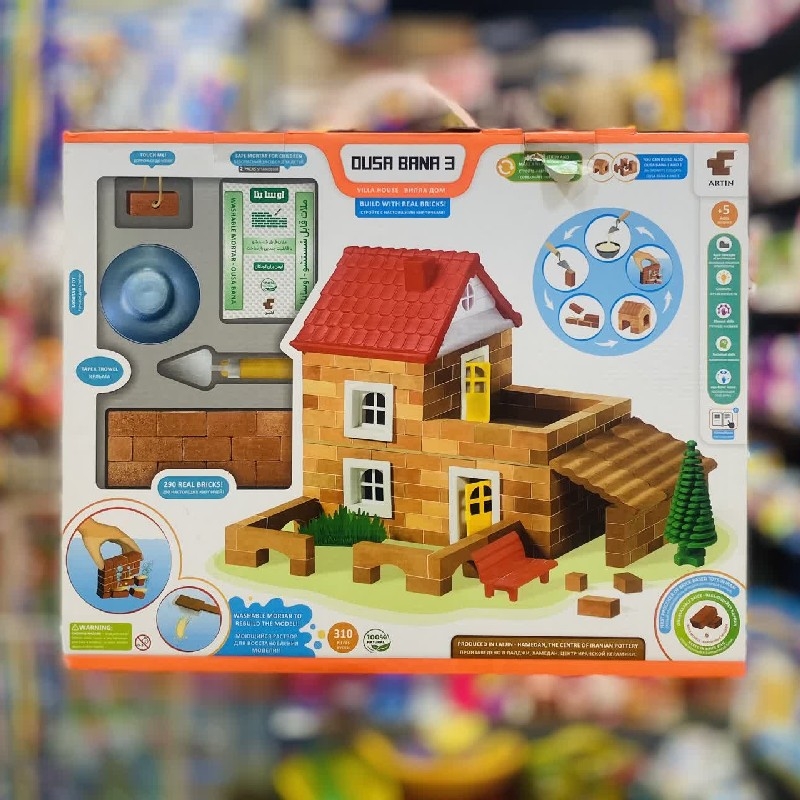 خونه ویلایی بزرگ اوسا بنا 3 یه اسباب بازی با آجر های واقعی و قابل شستشو برای بچه های 6 سال به بالاست که به کمک اون می تونن هیجان ساخت و طراحی و تجربه کنن.اسباب بازی ساختنی اوسا بنا 3، دارای مواد و متریال لازم جهت ساخت انواع خانه های آجری و حتی قلعه آجری می باشد. آجرهای این اسباب بازی ساختنی از جنس خاک رس مخصوص آجرسازی بوده و در کوره های آجرپزی در دمای بالای 1000 درجه سانتی گراد پخته شده است. لذا از مقاومت بالایی برخوردار بوده و قابل شست و شو هستند و قابلیت چندین بار استفاده را دارد
