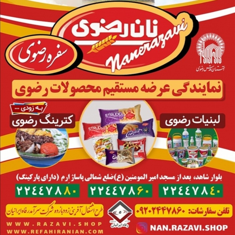 عرضه محصولات شیر، شیر موز، شیر عسل 200 سی سی رضوی و انواع کیک و دونات رضوی (تولیدی کارخانحات آستان قدس رضوی)